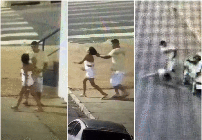 Uma câmera de segurança registrou o momento em que o homem puxa o cabelo da vítima na saída da festa. Em seguida, ele a persegue e, em uma nova sequência de agressão, a joga no chão (vídeo abaixo).