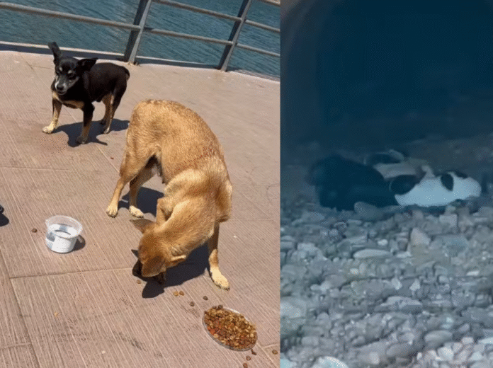 Nas imagens, é possível observar que se trata de um casal de cachorros e pelo menos cinco filhotes. O casal sai para receber alimentos de pessoas que passeiam pelo parque, enquanto os filhotes permanecem no bueiro.