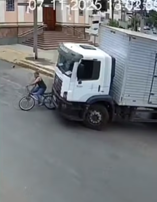 Imagens de câmeras de segurança mostram o momento em que o venezuelano faz a curva ao lado de um caminhão, quando o veículo avança pela rua e o acerta. O acidente ocorreu próximo da igreja São Gonçalo.