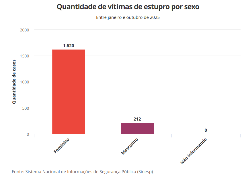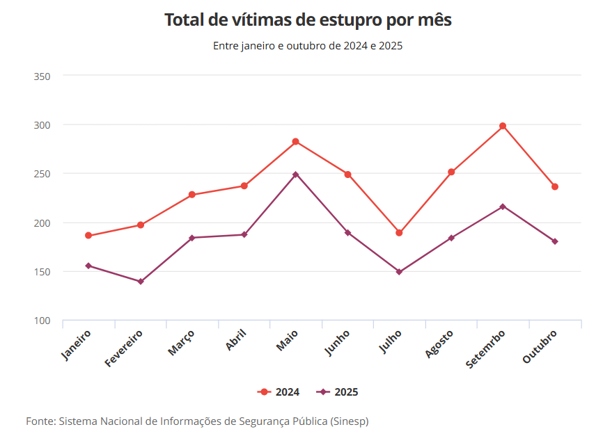 Dados da Segurança Pública apontam que entre janeiro e outubro de 2024 e 2025, foram registrados 4.185 casos de estupro no estado. Mulheres representam 88% das vítimas.
