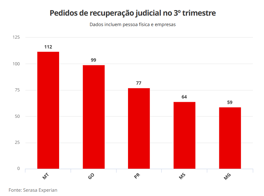 Mato Grosso apresentou o maior número de pedidos de recuperação judicial no agro no terceiro trimestre neste ano, de acordo com dados da Serasa Experian divulgados nessa segunda-feira (15).
