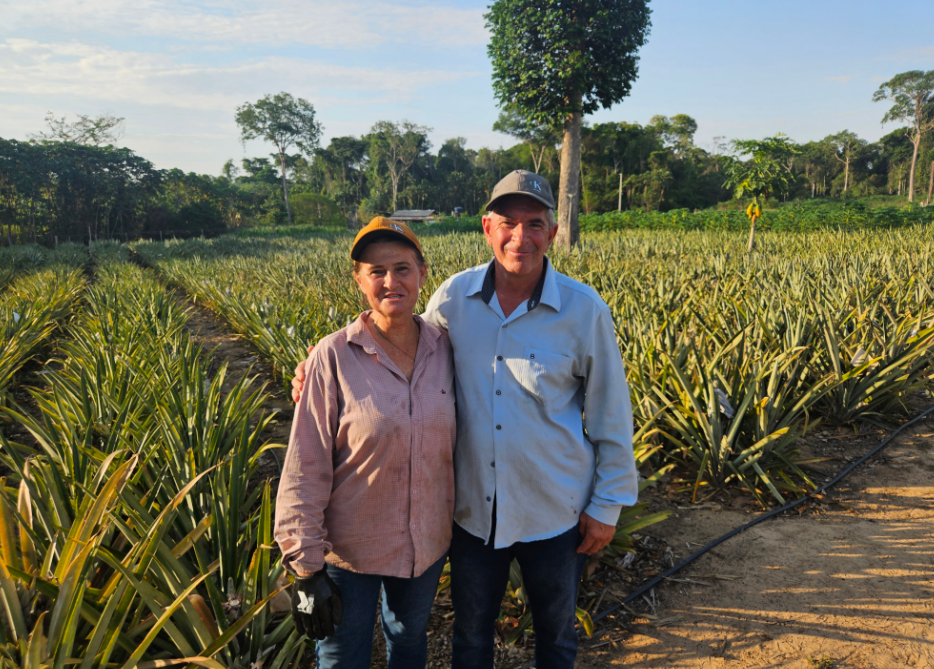 O casal Gebrair Pinheiro e Márcia Krindgies deixou a vida de servidores públicos em Lucas do Rio Verde para investir no sonho de viver da terra. Há três anos, eles adquiriram o Sítio Nossa Senhora das Graças, em Tapurah, e transformaram a antiga área de vegetação nativa em um modelo de produção agroecológica, com destaque para o cultivo de abacaxi. A propriedade é uma das 28 beneficiadas com kits de irrigação entregues pela Secretaria de Estado de Agricultura Familiar (Seaf) e conta com assistência técnica da Empresa Mato-grossense de Pesquisa, Assistência e Extensão Rural (Empaer).