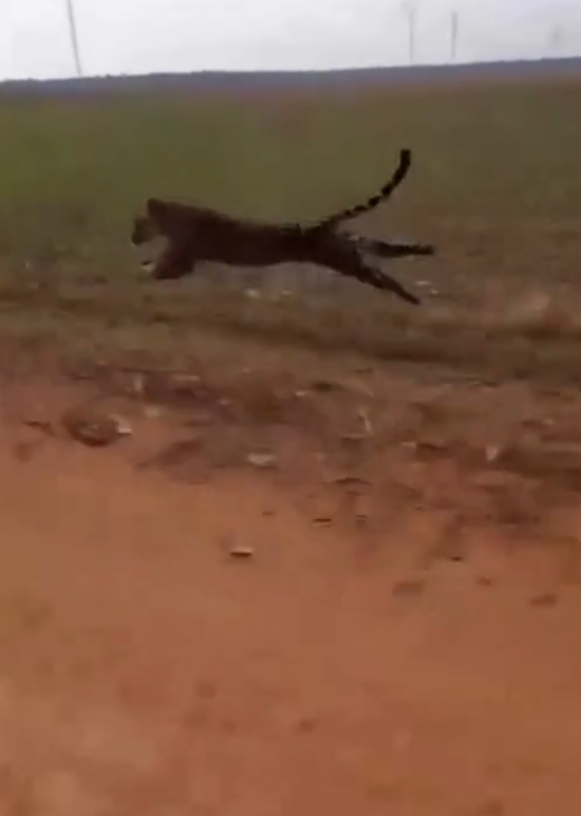 Uma onça-pintada foi registrada correndo à beira da estrada antes de atravessar a pista na frente do carro em que trabalhadores seguiam para uma fazenda em Nova Ubiratã, a 506 km de Cuiabá, nesta quarta-feira (19). O animal manteve distância do veículo por alguns instantes e, de forma repentina, cruzou a estrada. (Video abaixo)