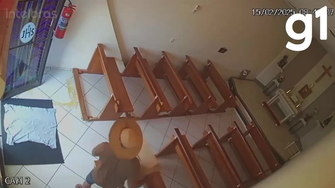 Câmeras de segurança da igreja registraram o momento do furto. Nas imagens, é possível ver que o homem está acompanhado de um comparsa, que não foi localizado (assista abaixo).