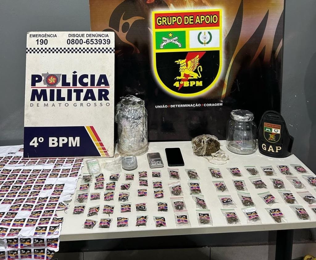 Além das porções, também foram apreendidos um tablete do mesmo entorpecente, duas balanças de precisão, um celular, diversos pacotes de plástico ziplock e uma caixa térmica.
