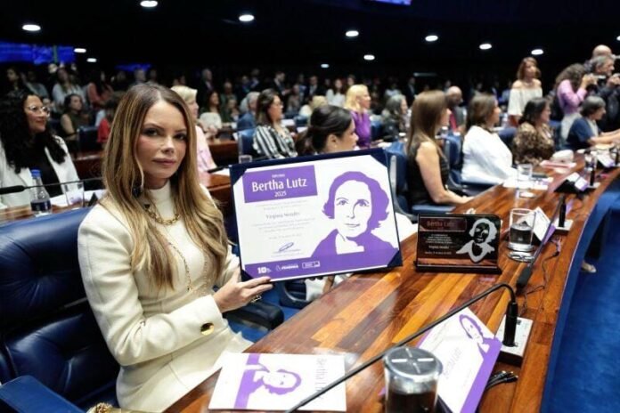 O trabalho social desenvolvido pela primeira-dama Virginia Mendes vem sendo reconhecido nacionalmente. Na semana passada, ela foi agraciada com o Diploma Mulher-Cidadã Bertha Lutz, em uma cerimônia realizada no plenário do Senado Federal, com a presença de autoridades e demais convidados.