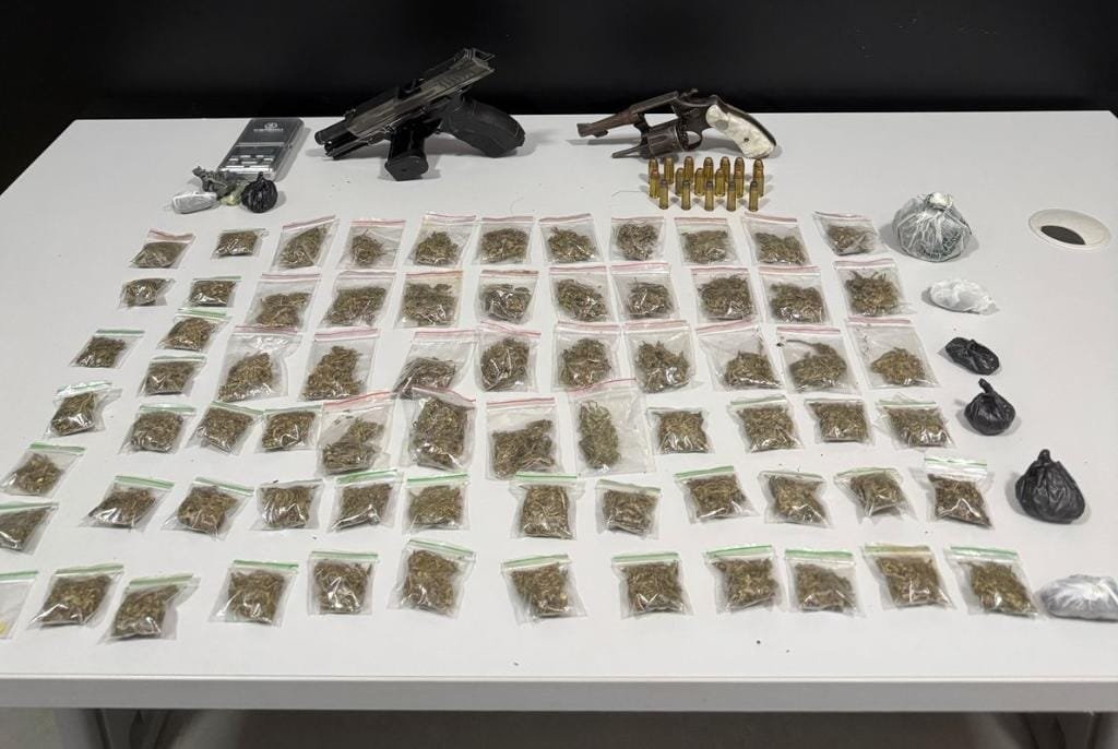 Os dois criminosos, um deles responsável por pilotar a motocicleta no dia da tentativa de latrocínio e o outro identificado como foragido da Penitenciária Central do Estado (PCE), foram localizados no endereço. Em buscas no local, os policiais encontraram uma mochila com duas armas de fogo, sendo uma pistola .40 com 13 munições e um revólver calibre 32 com cinco munições.