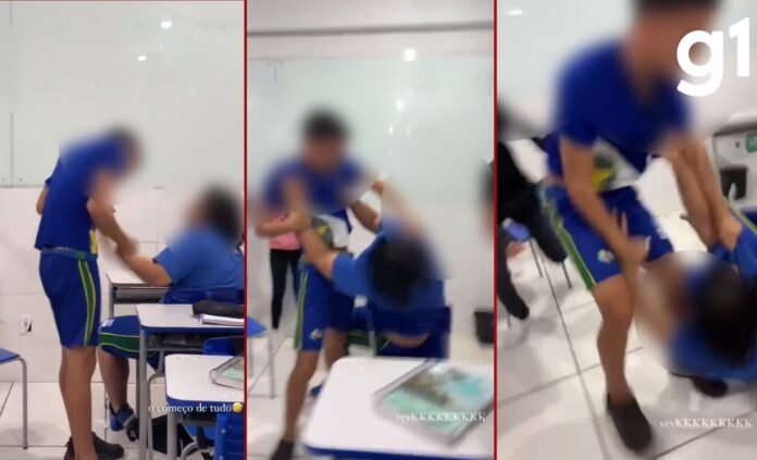 Nas imagens gravadas dentro da sala, é possível ver o momento em que o um adolescente puxa o cabelo do outro com força e o imobiliza. O aluno tenta se defender, mas é empurrado e, em seguida, leva um chute.