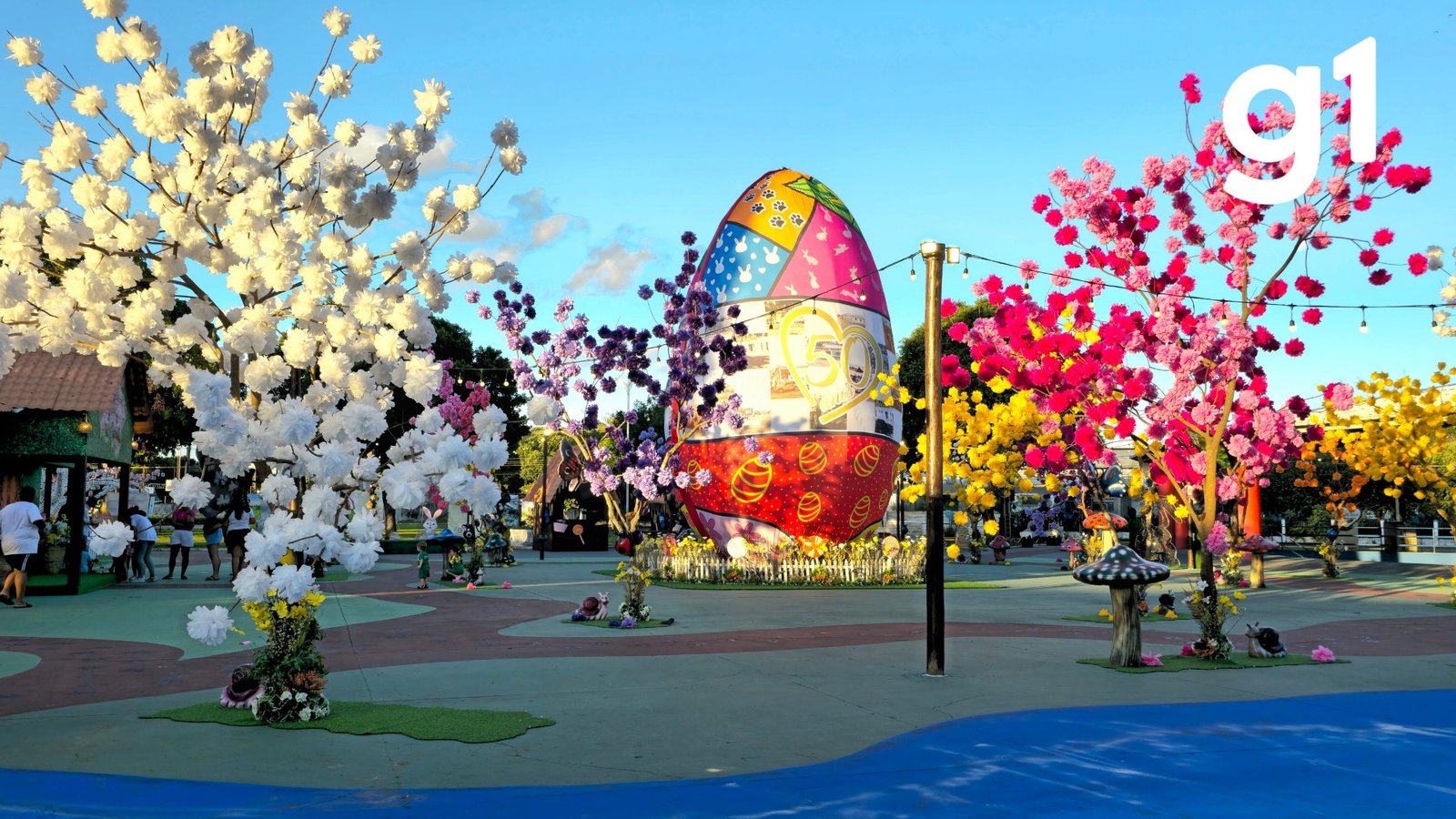 Com quase 10 metros de altura, o ovo é revestido por um tecido sublimado com desenhos e fotos da cidade. À noite, a estrutura ganha destaque com a iluminação de LED aproveitada do Natal, que foi reaplicada para compor a decoração da Páscoa. Ao redor, flores coloridas, esculturas de coelhinhos, borboletas, joaninhas e cogumelos complementam o cenário encantado.