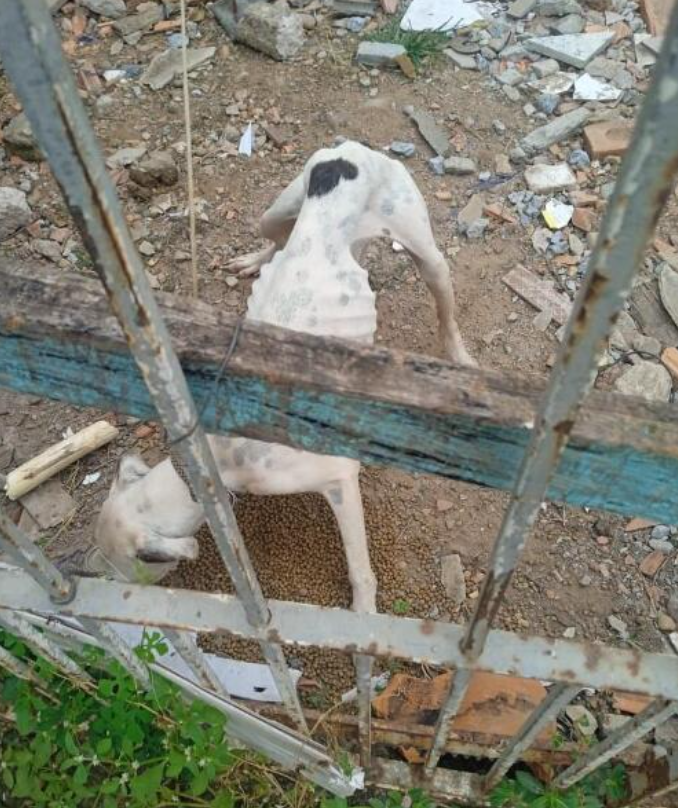 No local, os investigadores encontraram um casal de cachorros de porte médio, amarrado em uma corda. Segundo a Polícia Civil, a fêmea – de pelagem branca – apresentava estado de magreza extrema e infestação por parasitas, enquanto o macho – de pelagem preta – apresentava magreza acentuada, dificuldades para caminhar, inchaço na boca e quadro clínico bastante debilitado.