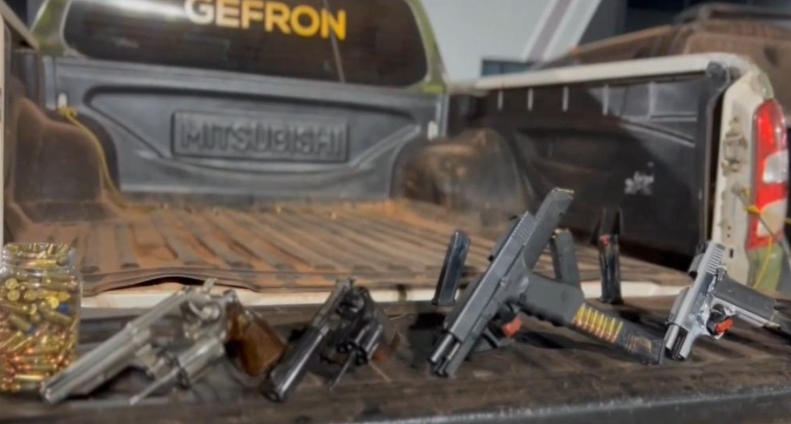 Com os suspeitos, dentro da caminhonete, foram encontrados e apreendidas sete armas de fogo, carabinas, pistolas e diversas munições.