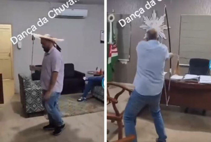 Um vídeo gravado na Prefeitura de Juara, a 690 km de Cuiabá, mostra uma simulação de “dança da chuva” feita pelo então chefe de gabinete Antônio José Santana Neto e o secretário municipal de Finanças, José Roberto Pereira Alves. Nas imagens, os servidores aparecerem utilizando adereços tradicionais indígenas, como cocar, arco e flecha (assista abaixo).