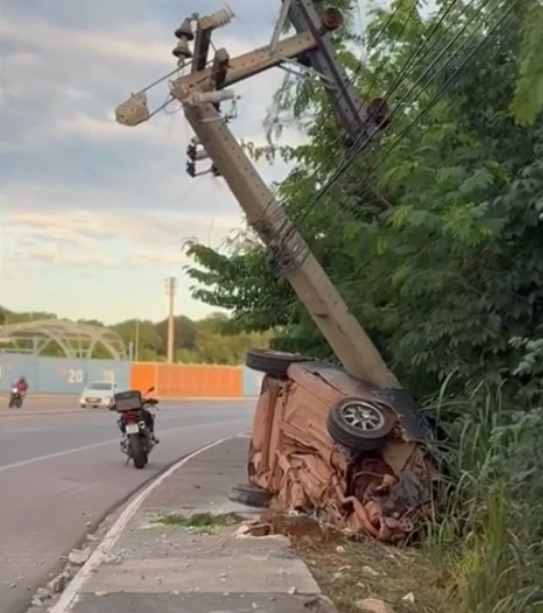 Vídeos registrados pela equipe da Guarda Municipal mostram o carro tombado e preso ao poste, às margens da pista.