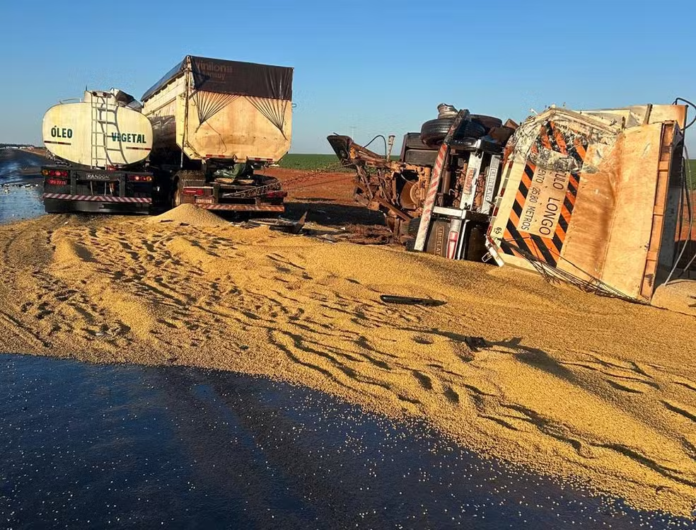 Segundo o Corpo de Bombeiros, a batida envolveu uma carreta que transportava soja e outra com óleo vegetal. As equipes atuaram na contenção do óleo com areia.