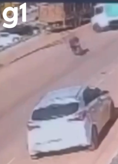 Um motociclista de 20 anos foi parar debaixo de um caminhão após atingir a lateral do veículo, em Juína, a 737 km de Cuiabá, nessa terça-feira (3). Um vídeo gravado por câmeras de segurança mostra o momento da batida (assista abaixo).