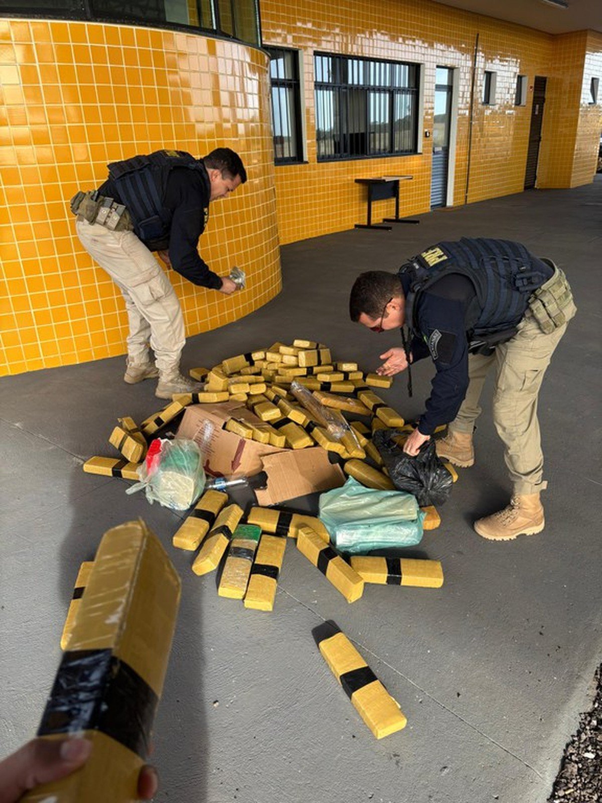 No veículo, foram encontrados 104 tabletes de cerca 112 de substância análoga à maconha, além de 3 tabletes de substância análoga à pasta base de cocaína e um de substância análoga ao cloridrato de cocaína.