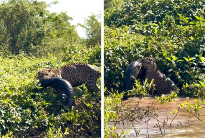 Nas imagens, o felino aparece camuflado na vegetação às margens do rio, aproximando-se da presa com lentidão e precisão. Ele nada silenciosamente até que, em um movimento repentino, ataca o réptil por trás, iniciando uma luta corporal dentro d’água. Em seguida, a onça sai da água com o jacaré na boca (veja vídeo abaixo).