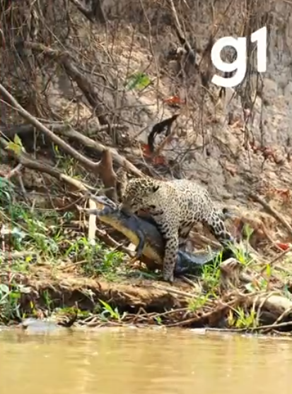 Um jacaré foi surpreendido pelo ataque de uma onça-pintada na região do Rio Três Irmãos, no Parque Estadual Encontro das Águas, entre Poconé e Barão de Melgaço, no Pantanal mato-grossense. No vídeo feito pelo biólogo e guia de turismo João Marcelo Rocha Biagini, é possível ver que o réptil quase escapa do ataque indo em direção ao rio, mas o felino é mais rápido e o captura (assista abaixo).