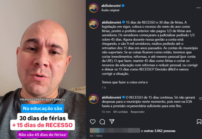 A medida atinge diretamente os servidores da rede municipal de ensino, que vinham recebendo o adicional tanto sobre os 30 dias de férias regulamentares quanto sobre o recesso escolar. “São 15 dias de recesso e 30 dias de férias, como todos os outros servidores têm direito. Nós não estamos fazendo nada além do que é certo para equilibrar as contas do município”, completou Abilio.
