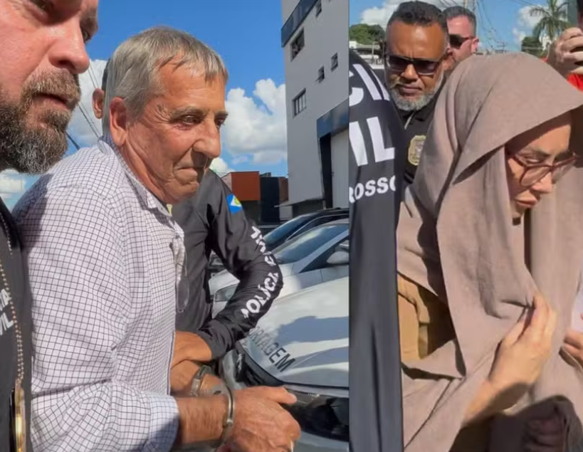 Cesar Jorge Sechi e Julinere Goulart Bastos são conduzidos à delegacia de Cuiabá — Foto: Ianara Garcia/TVCA