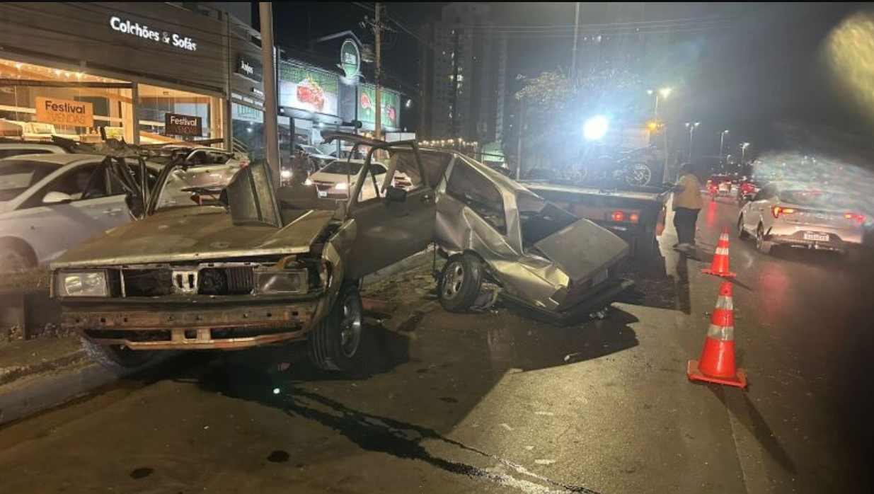 Um carro se partiu ao meio após se envolver em um acidente enquanto participava de um racha, em Cuiabá, nessa quinta-feira (24). De acordo com a Polícia Militar, três homens e uma mulher participavam da disputa.