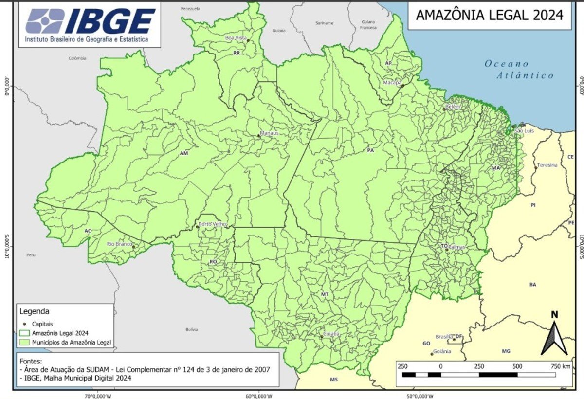 O mapa em questão foi produzido em 2024 e tinha como objetivo destacar os estados brasileiros que compõem a Amazônia Legal. Ele não fazia parte de um atlas impresso, mas sim de um material informativo disponibilizado online pelo órgão.