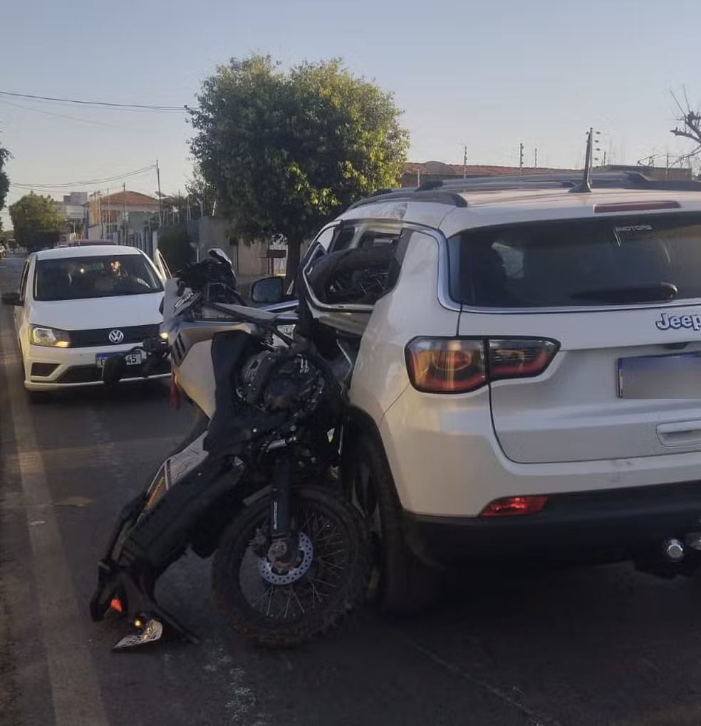 Vídeos registrados por moradores da região mostram que, com o impacto, a moto ficou presa na janela do veículo (assista abaixo).