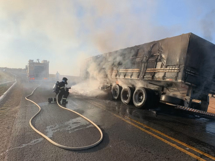 Conforme o boletim de ocorrência, o incêndio começou nos pneus do veículo. Em seguida, as chamas atingiram o semi reboque da carreta e a carga de adubo.