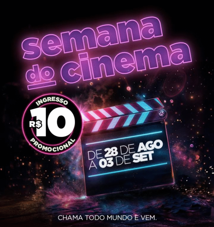 A Semana do Cinema terá uma segunda edição neste ano entre 28 de agosto e 3 de setembro, com ingressos que custam R$ 10, além de combos de pipoca e refrigerante com preços também reduzidos. A campanha cria um preço único promocional durante sete dias para promover o acesso ao cinema em todo o País.