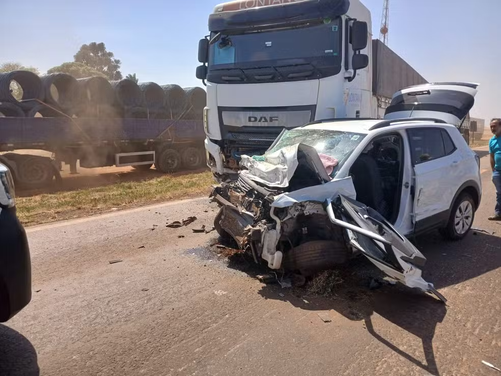 Principal suspeita é de que a carreta tenha batido na lateral do carro, que teve a frente destruída — Foto: Reprodução