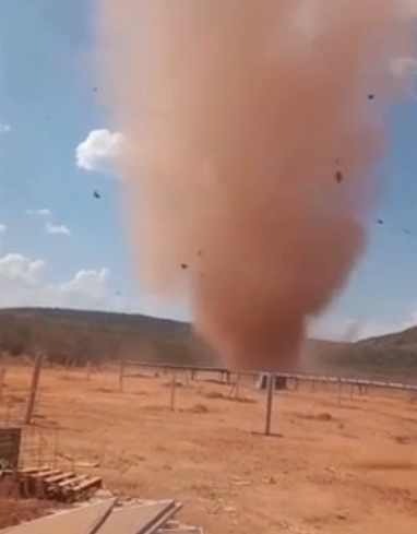 O trabalhador Marcos da Silva registrou de perto um redemoinho gigante de poeira em Diamantino, a 209 km de Cuiabá, nessa sexta-feira (29). Na gravação, é possível ouvir ele dizendo “vem aqui, vem aqui”, em questão de segundos, o redemoinho se aproxima, ele corre e dois colegas de trabalho quase ficam no meio do círculo de poeira (assista abaixo).