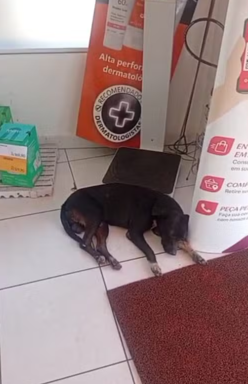 Claudio contou que estava apressado para comprar um remédio na e levar o almoço para a esposa, quando viu o vira-lata entrando no estabelecimento. “Ele chegou com língua de fora, sentou perto da porta e até virou o olho, aliviado com o ar fresco”, afirmou.