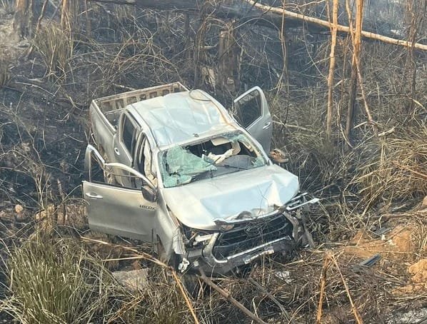 Conforme a PM, uma árvore de grande porte, comprometida pelo incêndio, caiu sobre a caminhonete, o que pode ter provocado o capotamento.