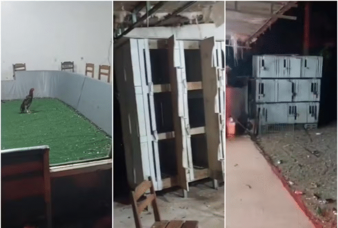 Segundo a polícia, próximo a um bar montado no espaço onde eram realizadas as disputas, foram encontrados 74 galos em gaiolas e 30 em poleiros, além de dois galos feridos em uma arena de combate. Um terceiro animal já estava morto no local. Em um vídeo registrado pelos policias mostra a arena utilizada para a briga das aves, além das gaiolas onde os animais eram mantidos (veja abaixo).