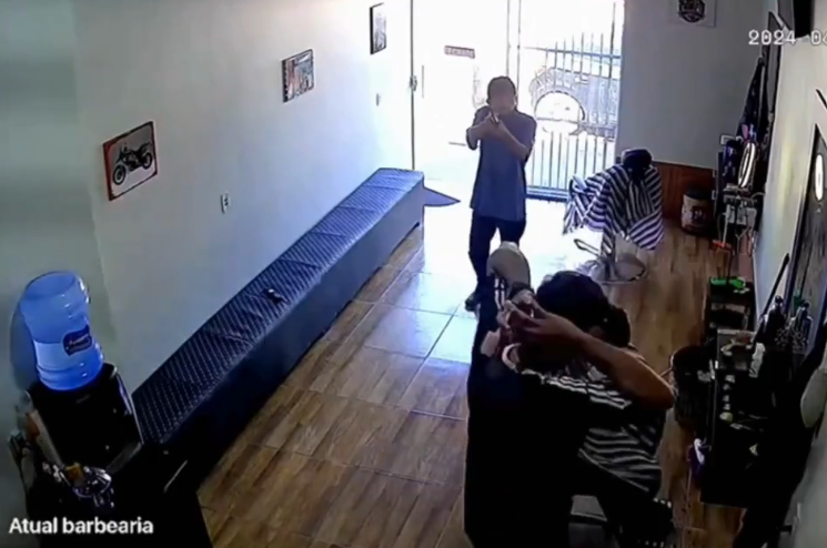 Câmeras de segurança do estabelecimento registraram o momento em que o suspeito entrou no local se passando por cliente e ficou sentando no banco de espera da barbearia. Minutos depois, ele anuncia um suposto assalto e atira contra o jovem.