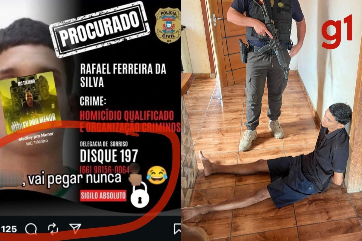 Rafael Ferreira da Silva, de 23 anos, debochou da polícia em uma publicação nas redes sociais enquanto estava foragido. Ele é suspeito de matar o tatuador Rone Gomes dos Santos, de 37 anos, em Sorriso, a 420 km de Cuiabá, e foi preso nesta quarta-feira (10), no Distrito de Castelo dos Sonhos, em Altamira (PA).