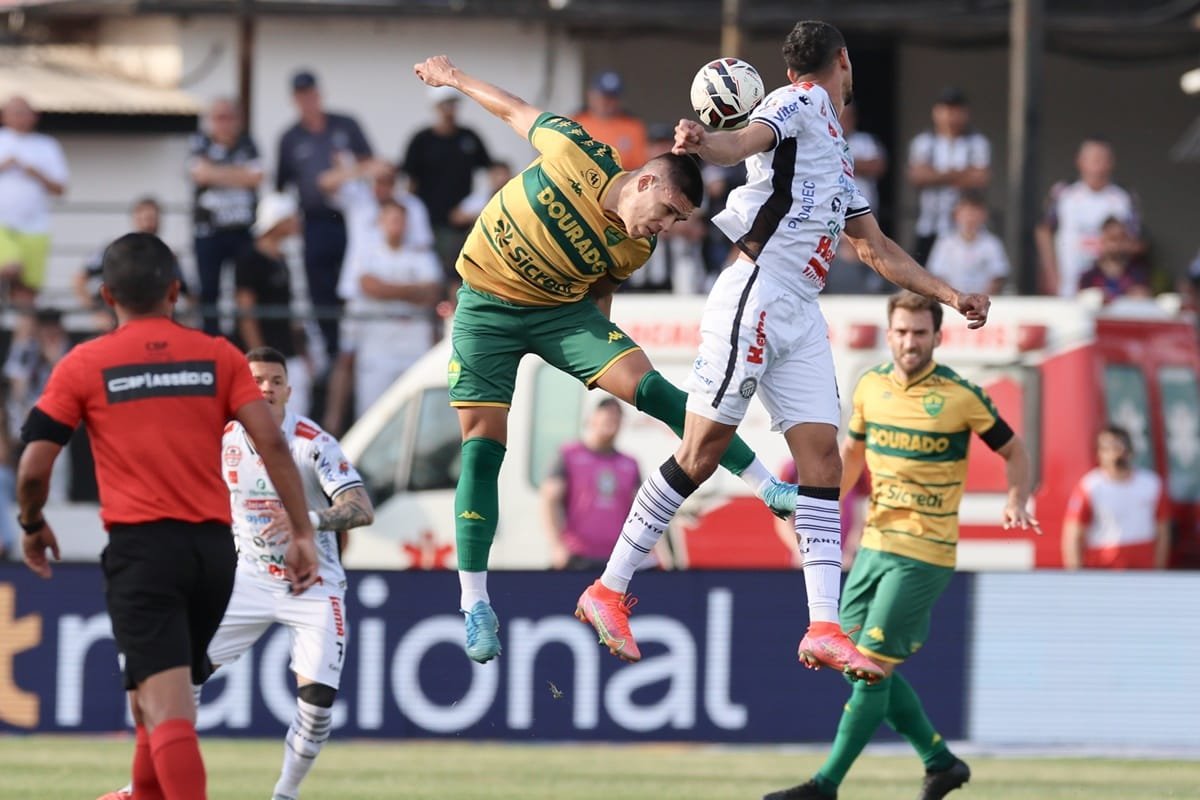 A partida começou agitada, com o Cuiabá pressionando desde o início, especialmente em jogadas de escanteio. O primeiro gol saiu justamente em uma dessas situações: Mateusinho cobrou escanteio e cruzou na área, Natan subiu mais alto que Boschilia, cabeceou, e a bola, após tocar na trave, entrou. Antes disso, o Dourado já havia carimbado a trave em lance semelhante.