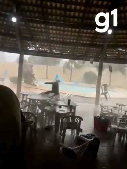 Nas imagens, é possível ver mesas e cadeiras sendo arremessadas pelo vento forte. Em outra imagem, os prédios quase somem em meio à poeira.