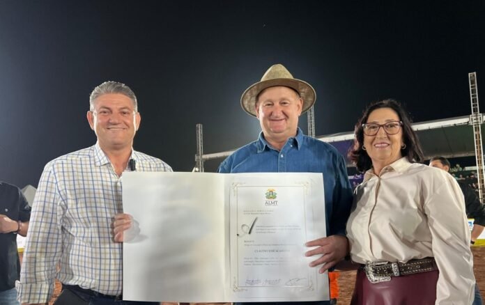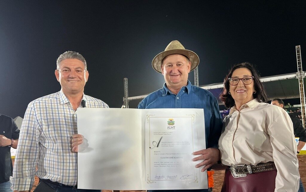 A Assembleia Legislativa de Mato Grosso (ALMT), por iniciativa do deputado Valmir Moretto (Republicanos), concedeu nesta quinta-feira (18) o Título de Cidadão Mato-grossense ao prefeito de Sapezal, Cláudio José Scariote (Republicanos). A solenidade ocorreu no Parque de Exposição da cidade e marcou o início das festividades do aniversário do município, que completa 31 anos de emancipação política nesta sexta-feira (19).