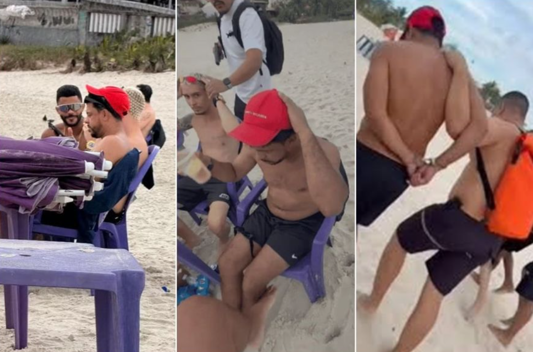 Vídeos registrados por policiais civis mostram o momento em que Ederson Xavier de Lima, conhecido como Boré, chefe da facção Comando Vermelho, em Mato Grosso, é preso em uma em uma praia de Niterói, na Região Metropolitana do Rio, nesse domingo (28).