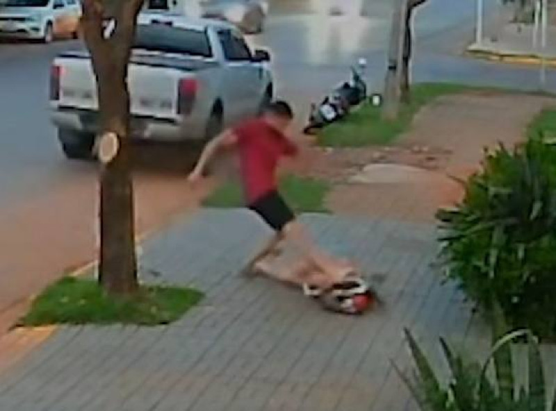 A vítima desce da moto e tenta correr. O agressor desce do veículo, vai até a moto, pega uma pedra arremessa contra a vítima, que corre em volta do veículo. Para se defender, a mulher também arremessa pedras contra o agressor.