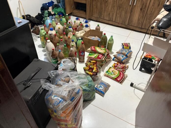 Os policiais encontraram as cestas básicas dentro da casa, além de diversos itens de higiene e de limpeza guardados em um armário.