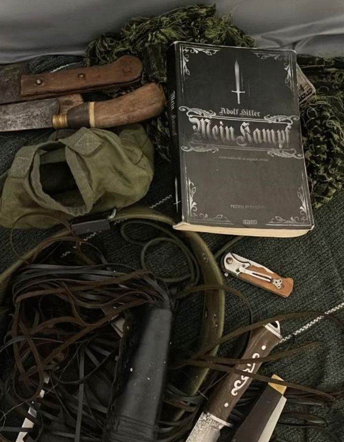 Na casa do investigado, os agentes encontraram uma edição do livro Mein Kampf, de autoria de Adolf Hitler. A apologia do nazismo é crime e se enquadra na Lei 7.716/1989.