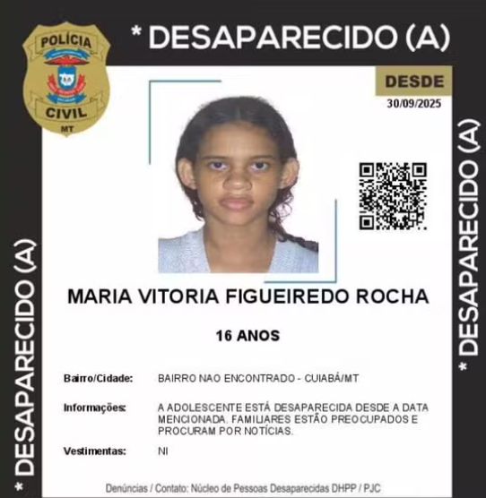 Maria Vitória Figueiredo Rocha, de 16 anos, está desaparecida desde terça-feira (30), quando foi vista pela última vez na casa da família no bairro Jardim Florianópolis, em Cuiabá. A adolescente está na lista para receber um transplante de rim e precisa de acompanhamento médico três vezes na semana.