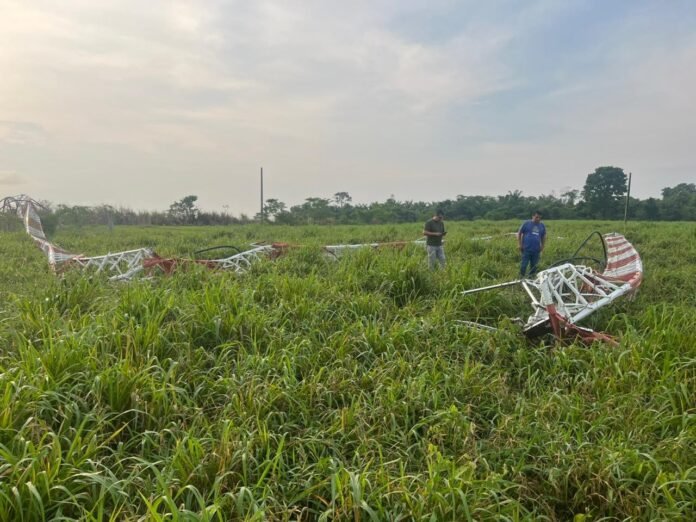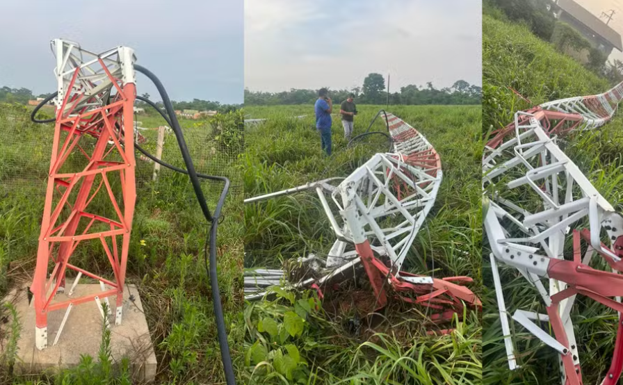 Imagens feitas no local mostram que, após cair, a estrutura da torre ficou retorcida e com a fiação de energia elétrica espalhada por uma área de pasto.