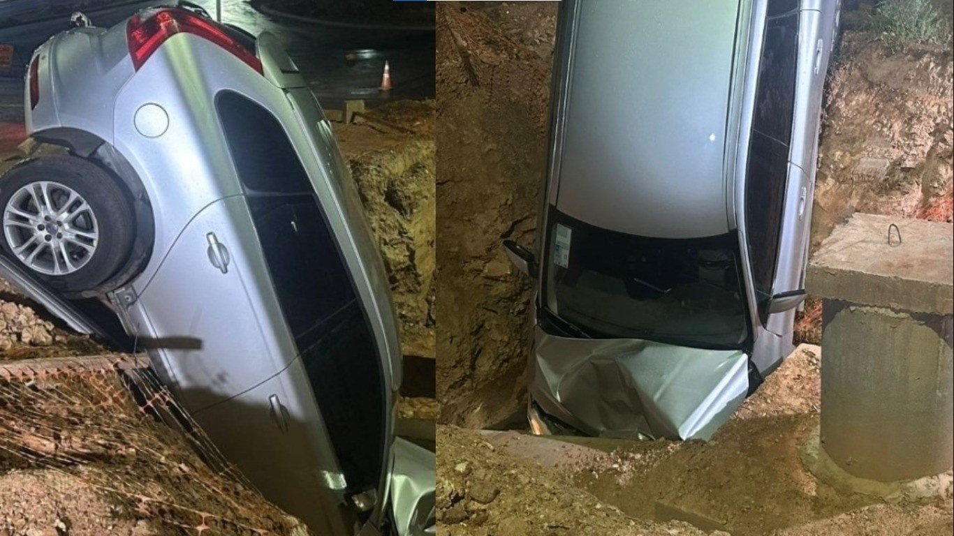 Uma motorista de 49 anos, que não teve a identidade divulgada, perdeu o controle da direção de um carro de luxo da marca Volvo e caiu em uma valeta de obras localizada no Centro Político Administrativo, em Cuiabá, neste domingo (5).