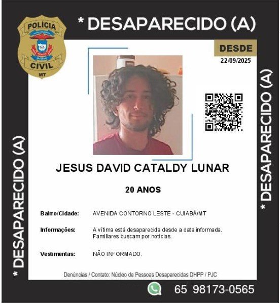 A Polícia Civil investiga o desaparecimento um jovem venezuelano de 20 anos, identificado como de Jesus David Cataldy Lunar, ele não é visto desde o dia 22 de setembro, em Cuiabá. O caso foi registrado pela mãe do jovem, que relatou não ter mais tido contato com o filho desde aquela data.