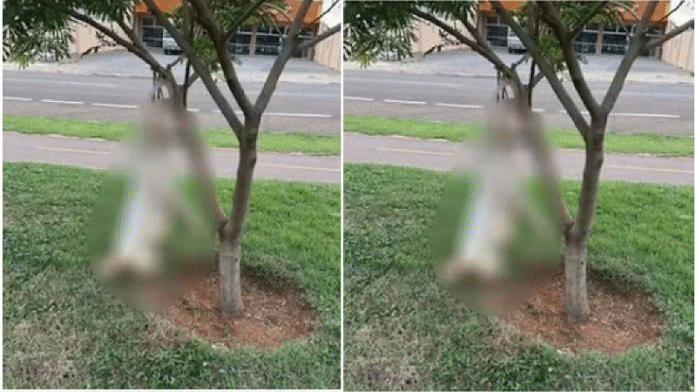 Um cachorro foi encontrado morto, enforcado e parcialmente pendurado em uma árvore na Avenida Blumenau, em Sorriso, a 420 km de Cuiabá, nesta quarta-feira (16). O animal estava amarrado com uma corda.
