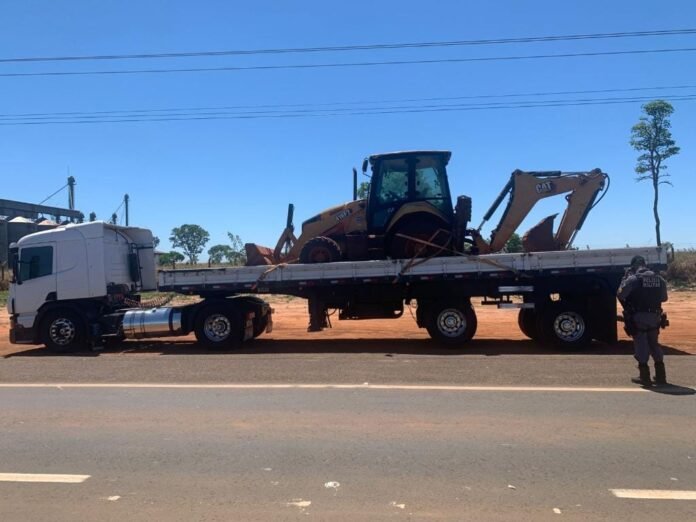 Uma retroescavadeira roubada em São Paulo foi recuperada nesta segunda-feira (20) por policiais militares do 15º Batalhão, com apoio da Polícia Militar de Goiás, na rodovia MT-100, entre Alto Taquari e Alto Araguaia, em Mato Grosso. Um homem foi preso em flagrante suspeito por receptação.