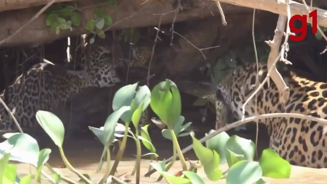 Duas onças-pintadas adultas, um macho e uma fêmea, foram flagradas durante uma espécie de “cabo de guerra” com uma sucuri-amarela, no Parque Estadual Encontro das Águas, no Pantanal mato-grossense.
